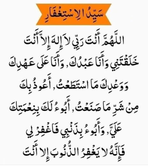 اللهم أنت ربي ، لا إله إلا أنت خلقتني وأنا عبدك ، وأنا على عهدك ووعدك ما استطعت ، أعوذ بك من شر ما صنعت ، أبوء لك بنعمتك علي وأبوء لك بذنبي ، فاغفر لي فإنه لا يغفر الذنوب إلا أنت )