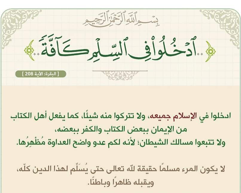 • ﴿..ادْخُلُوا فِي السِّلْمِ كَافَّةً..﴾. [ البقرة: الآية 208 ] 〰️〰️〰️〰️〰️〰️〰️〰️〰️ • ادخلوا في الإسلام جميعه، ولا تتركوا منه شيئًا، كما يفعل أهل الكتاب من الإيمان ببعض الكتاب والكفر ببعضه، ولا تتبعوا مسالك الشيطان؛ لأنه لكم عدو واضح العداوة مُظْهِرُها. 〰️〰️〰️〰️〰️〰️〰️ لا يكون المرء مسلمًا حقيقة لله تعالى حتى يُسَلِّم لهذا الدين كلّه، ويقبله ظاهرًا وباطنًا.[ المختصر في التفسير ] 〰️〰️〰️〰️〰️〰️〰️〰️ https://www3.0zz0.com/2021/07/18/19/841900792.jpg |