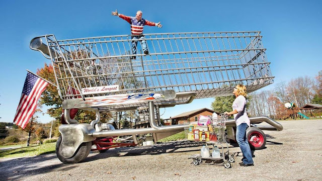 هذه هي أكبر عربة تسوق في العالم، والتي يبلغ ارتفاعها ارتفاعها 4.57 متراً، وبطول 8.23 متراً، وعرض 2.43 متراً.