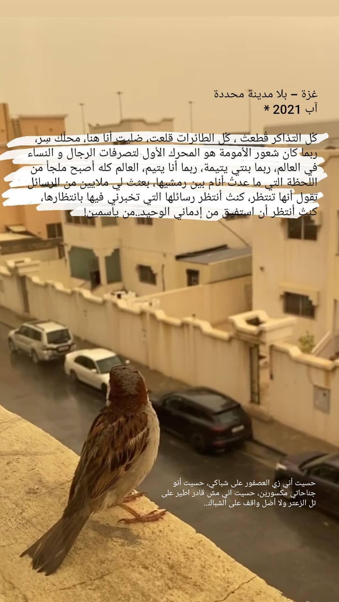 التقيتُ بياسمين بعدما شُفيت تماماً، وكادت نور تنسى، ملامحي الأولى، التي كانت تتوسد وجهي قبل أن يقرر عبدالله على انتهاء المهزلة التي تجري حولنا، لا أدري إن كان شفائي شك يتلوى بين الشوارع أما أنني اليقين الوحيد الذي، يلتقي بياسمين في أيامه القادمة، تغير كل شيء، إلا لحيتي، ظللتُ أعلّق صوري عليها، أكتب أغاني الطرب فيها، وأخبأ كل وسادات النوم لياسمين، اشتقتُ إلى فلسطين، التي بطريقة ما، لا تشبه شيء في كونها إلا ياسمين، تمنيتُ لو أني ضممتها في صدري المغترب، قلتُ تحيا ياسمين حبيبتي حرة، المجد و الخلود لعينيها الأبرار، لكني ما قلت إلا أنني فلسطيني معتّر ..