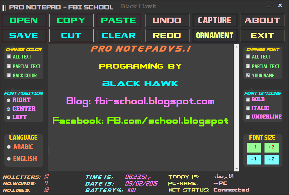 وتحتوي المفكرة على برنامج للزخرفة العادية وزخرفة الفيس بوك ( الزخرفة العربية والانجليزية )